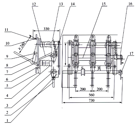 1、框架 2、接地刀片 3、接地開關軸 4、支柱絕緣子 5、接地轉軸 6、支座接地板 7、刀片 8、滅弧管 9、拉簧接鈕簧銷軸 10、導向片 11、觸座接線板 12、拉桿 13、負荷開關軸 14、接線開關彈簧儲能機構 15、接地開關彈簧儲能機構 16、負荷開關操作機構 17、接地開關操作機構 |