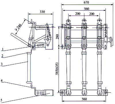 1、FN5-12D負荷開關 2、支座熔斷器接線板 3、熔管 4、熔斷器接線板 5、熔斷器支架 注:配RN3熔管電流75A及75A以上的安裝尺寸為括號內尺寸。 |