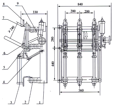 1、低架 2、絕緣子 3、熔管 4、脫扣裝置 5、動觸頭 6、滅弧管 7、導向片 8、靜觸頭 9、分合閘機構 |