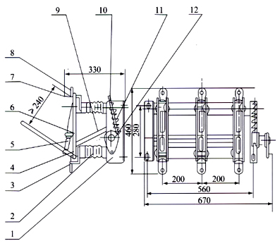 1、框架 2、支柱絕緣子 3、支座接線座 4、刀片 5、滅弧管 6、扭簧及扭簧銷軸 7、導向片 8、觸座接線板 9、拉桿 10、負荷開關轉軸 11、彈簧儲能機構 12、操作機構 |
